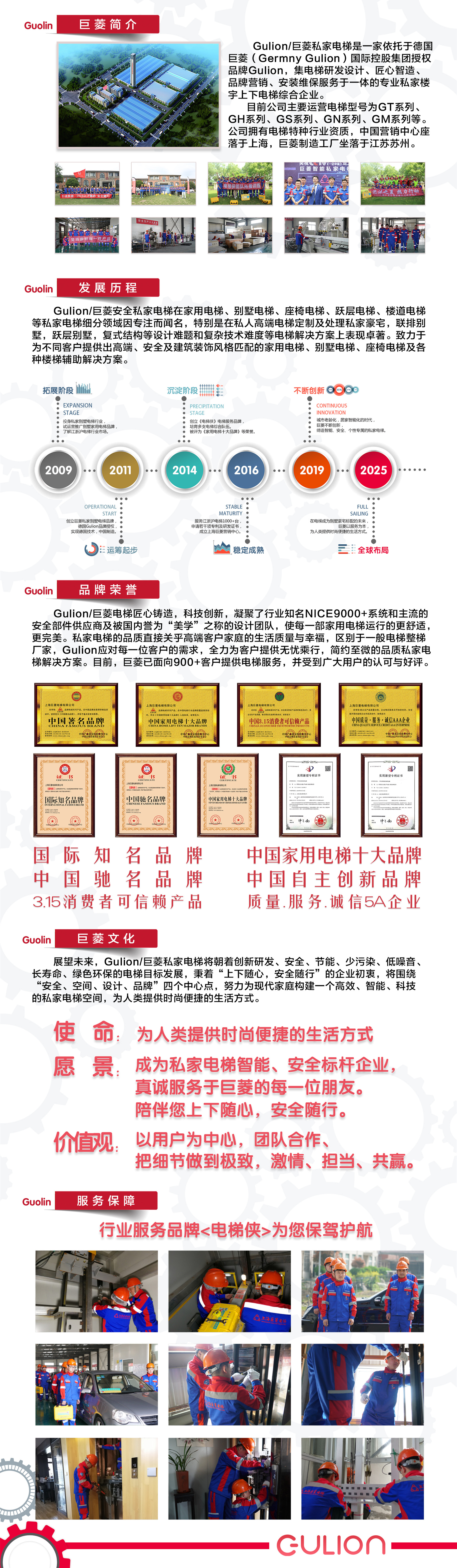 Gulion巨菱私家電梯是一家依托于德國巨菱(GERMANY GULION)國際控股集團德國授權(quán)品牌GULION,集電梯研發(fā)設(shè)計、匠心智造、品牌營銷、安裝維保服務(wù)于一體的專業(yè)私家樓宇上下電梯綜合企業(yè)。目前公司主要運營電梯型號為GT系列、GH系列、GS系列、GN系列、GM系列等。公司擁有電梯特種行業(yè)資質(zhì),中國營銷中心座落于上海,毗鄰于上海大虹橋版塊。